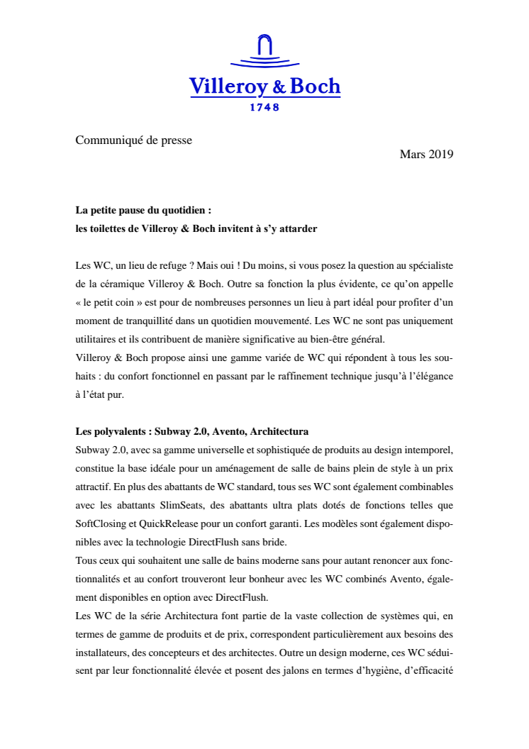 Les WC, un lieu de refuge ? Mais oui ! Du moins, si vous posez la question au spécialiste de la céramique Villeroy & Boch. Outre sa fonction la plus évidente, ce qu’on appelle « le petit coin » est pour de nombreuses personnes un lieu à part idéal pour profiter d’un moment de tranquillité dans un quotidien mouvementé.