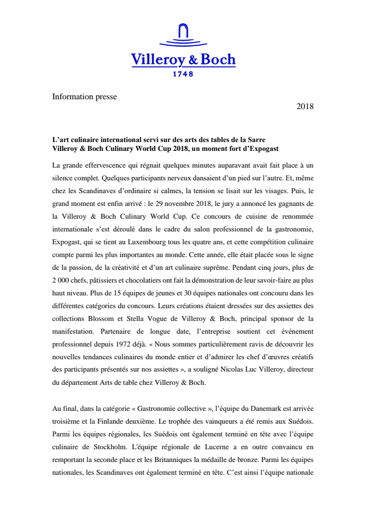 Le 29 novembre 2018, le jury a annoncé les gagnants de la Villeroy & Boch Culinary World Cup. Ce concours de cuisine de renommée internationale s’est déroulé dans le cadre du salon professionnel de la gastronomie, Expogast, qui se tient au Luxembourg tous les quatre ans, et cette compétition culinaire compte parmi les plus importantes au monde.