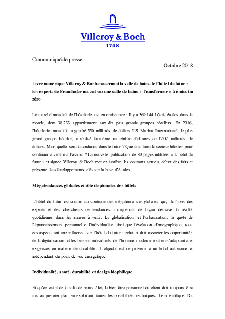 Livre numérique Villeroy & Boch concernant la salle de bains de l’hôtel du futur : les experts de Fraunhofer misent sur une salle de bains « Transformer » à émission zéro