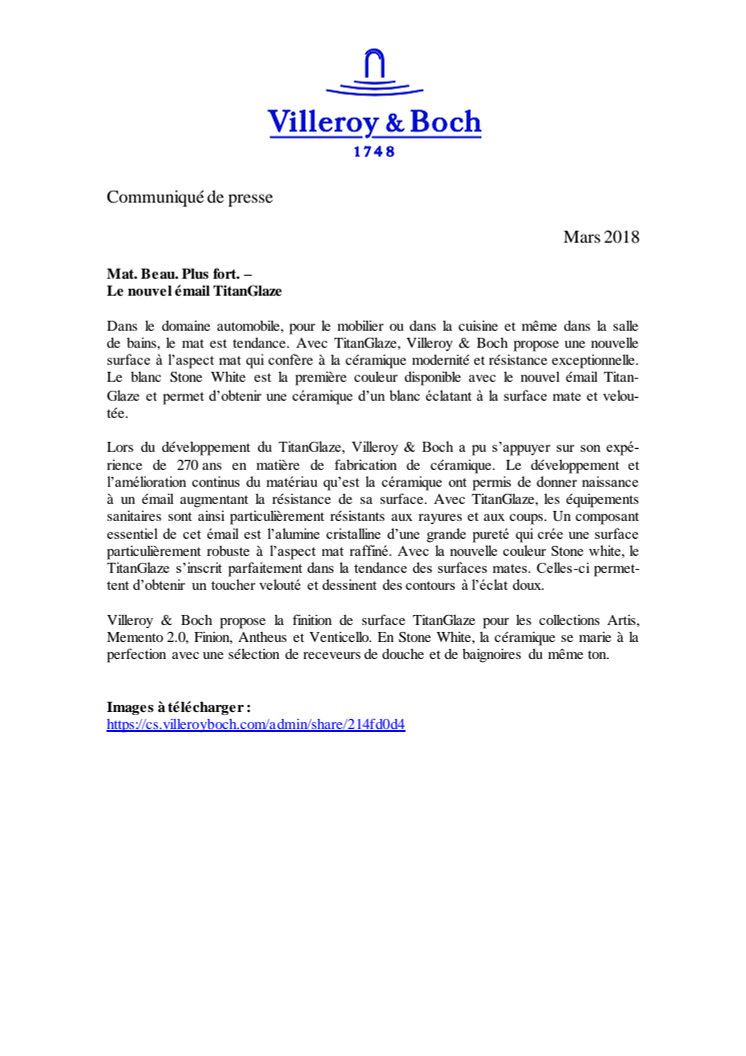 Dans le domaine automobile, pour le mobilier ou dans la cuisine et même dans la salle de bains, le mat est tendance. Avec TitanGlaze, Villeroy & Boch propose une nouvelle sur-face à l’aspect mat qui confère à la céramique modernité et résistance exceptionnelle.