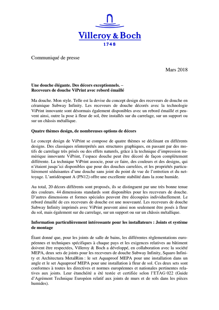 Ma douche. Mon style. Telle est la devise du concept design des receveurs de douche en céramique Subway Infinity. Les receveurs de douche décorés avec la technologie ViPrint innovante sont désormais également disponibles avec un rebord émaillé et peuvent ainsi, outre la pose à fleur de sol, être installés sur du carrelage, sur un support ou sur un châssis métallique.