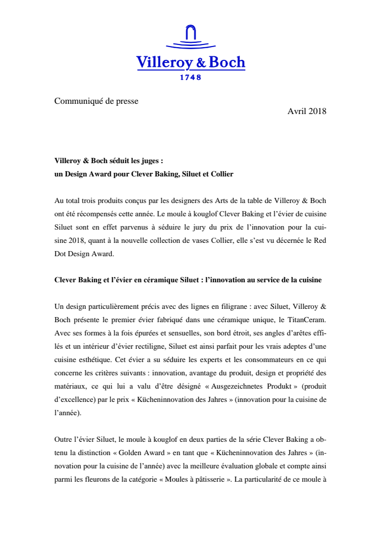 Au total trois produits conçus par les designers des Arts de la table de Villeroy & Boch ont été récompensés cette année. Le moule à kouglof Clever Baking et l’évier de cuisine Siluet sont en effet parvenus à séduire le jury du prix de l’innovation pour la cuisine 2018, quant à la nouvelle collection de vases Collier, elle s’est vu décernée le Red Dot Design Award.
